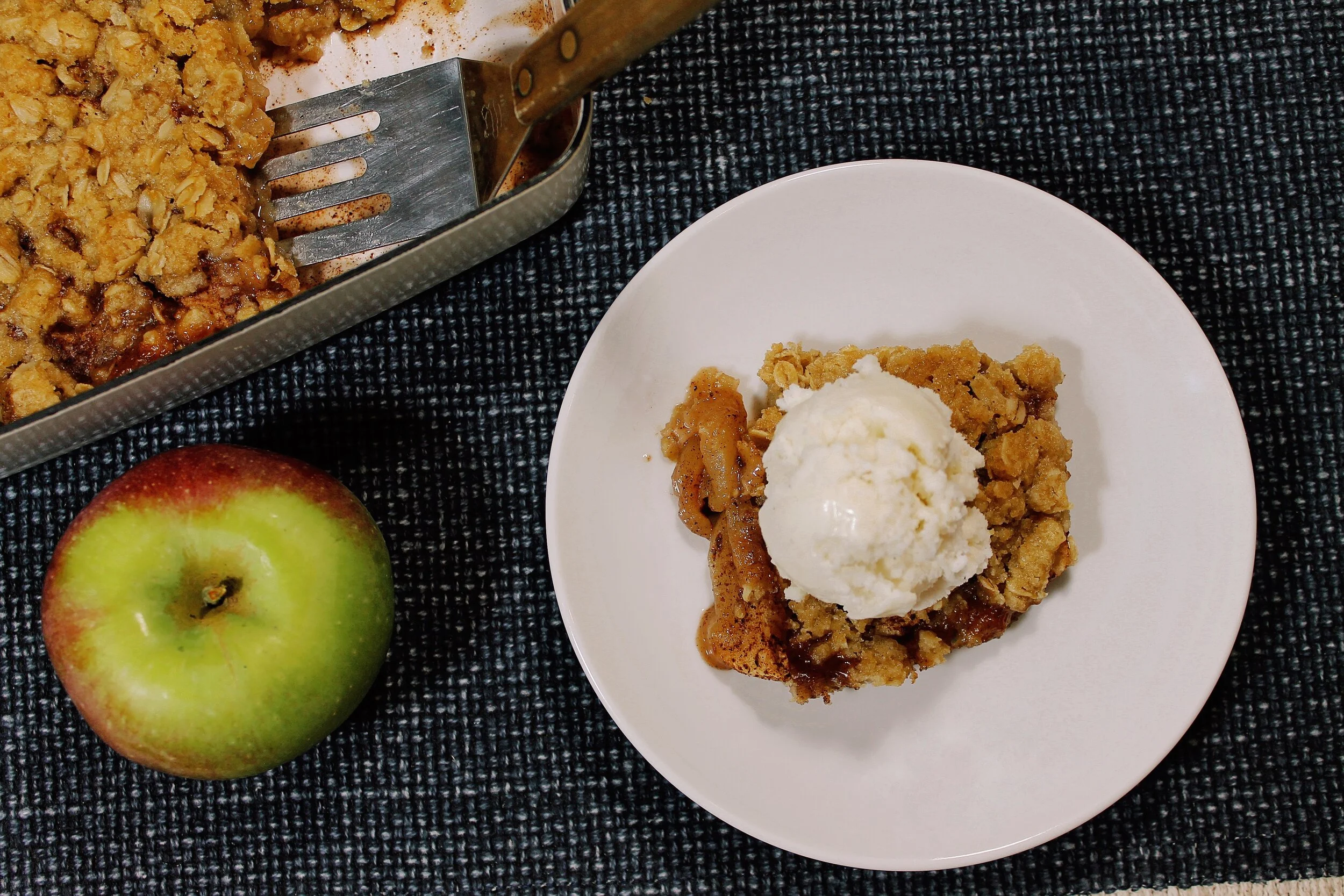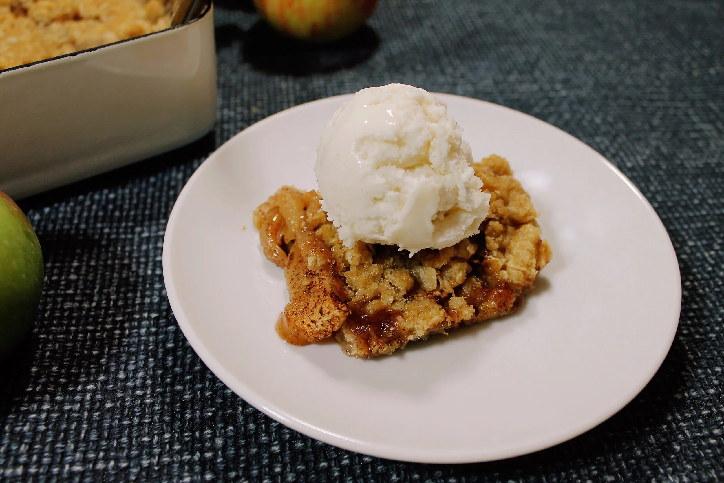 When your crisp is done, it should be a nice golden brown, and your house should smell amazing. I like to serve mine with a scoop of vanilla ice cream. I think this complements the warm spices nicely and adds a creaminess to the crunch of the topping and the softness of the apples.